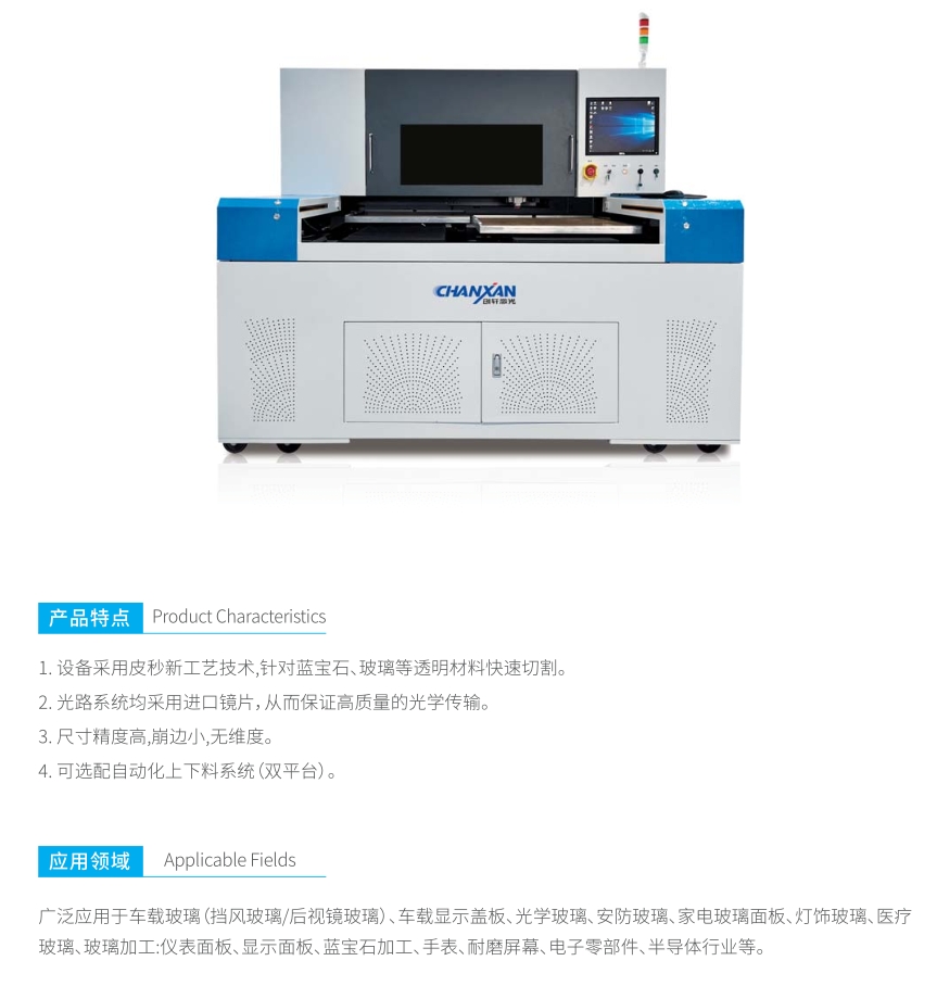 1.設備采用皮秒新工藝技術,針對藍寶石、玻璃等透明材料快速切割。 2.光路系統均采用進口鏡片,從而保證高質量的光學傳輸。 3.尺寸精度高,崩邊小,無維度。 4.可選配自動化上下料系統(雙平臺)。