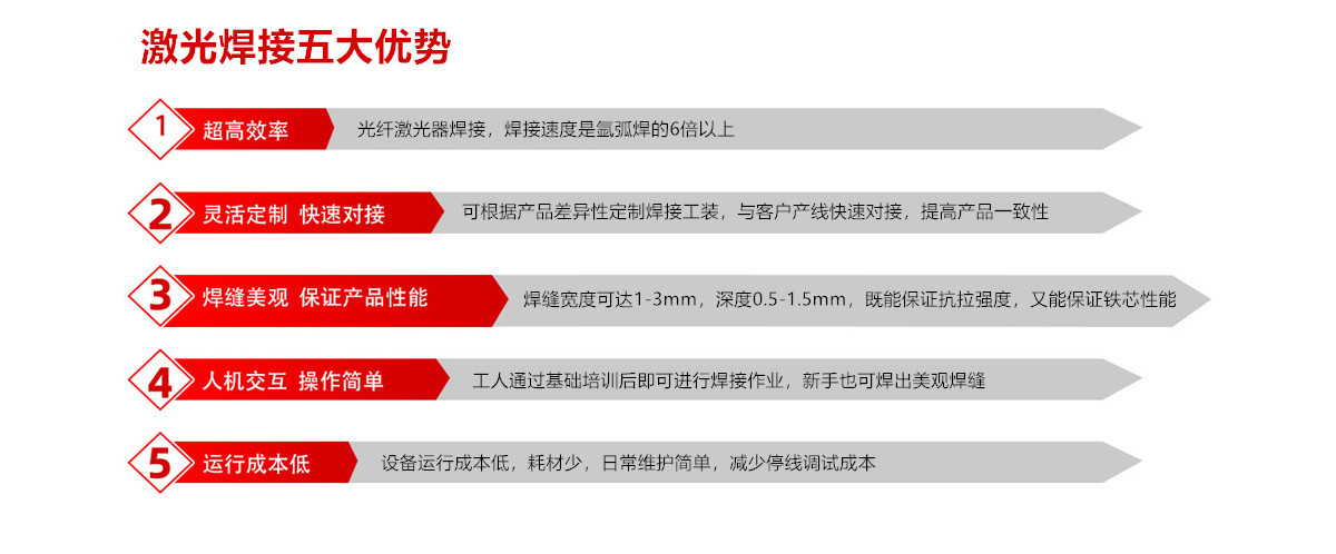 3. 焊縫美觀,保證產(chǎn)品性能;焊縫寬度可達1-3mm,深度0.5-1.5mm,既能保證抗拉強度,又能最大程度保證鐵芯性能